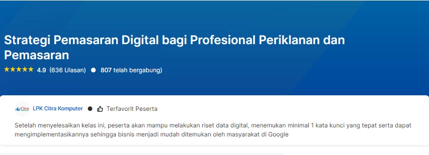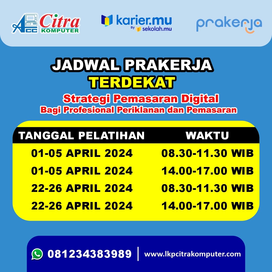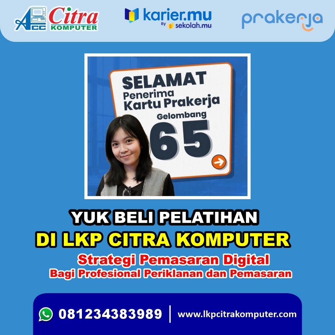 Bagi Anda yang ingin meningkatkan keterampilan dan pengetahuan di bidang pemasaran digital, pelatihan Prakerja "Strategi Pemasaran Digital bagi Profesional Periklanan dan Pemasaran" di LKP Citra Komputer bisa menjadi pilihan yang tepat.