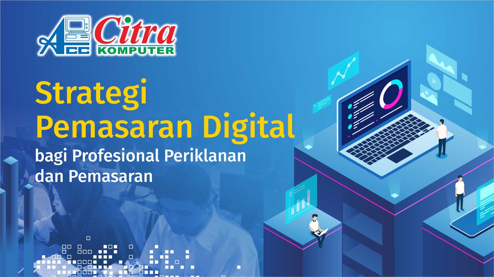 Berdasarkan latar belakang diatas, LKP Citra Komputer berkolaborasi dengan Prakerja untuk membuat pelatihan yang berjudul “Strategi Pemasaran Digital bagi Profesional Periklanan dan Pemasaran”. Melalui pelatihan ini, peserta akan diberikan bekal mengenai gambaran umum seorang profesional periklanan dan pemasaran. Tujuannya agar peserta mampu melakukan riset data digital terhadap sebuah produk/merek dengan menentukan kata kunci yang tepat dan mengimplementasikannya dalam aktivitas pemasaran bisnis. Selanjutnya peserta akan diberikan bekal tambahan seperti cara menggunakan Google Trends untuk riset data dan mengolah data, Google Form untuk membuat form digital, Google Profil Bisnis untuk membuat listing bisnis, posting dan iklan berbayar.